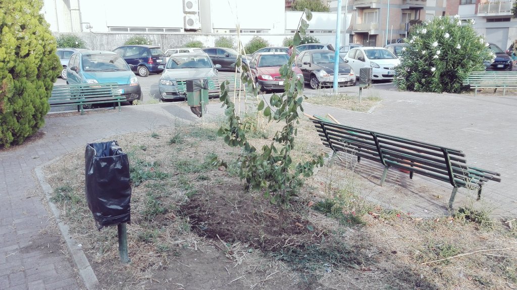 Un giovane visciolo salvato dal taglio appena piantato in Piazza degli Artisti (Rione Isonzo - R6). Il visciolo è una pianta tipica della nostra zona ma sempre meno comune a causa della "bonifica" selvaggia della macchia naturale. Lo restituiamo al quartiere perché tutti possano godere dei suoi frutti!